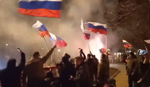 Εορτασμοί στους δρόμους ξέσπασαν στις αποσχισθείσες δημοκρατίες, τις οποίες η Ουκρανία θεωρεί ως δικό της έδαφος, αργά το βράδυ της Δευτέρας, αφότου ο πρόεδρος Βλαντίμιρ Πούτιν είπε ότι η Μόσχα «θα αναγνωρίσει αμέσως τις Λαϊκή Δημοκρατία του Ντονέτσκ (DPR) και του Λουγκάνσκ (LPR), μεταδίδουν ρωσικά μέσα ενημέρωσης (φωτογραφία, επάνω, από το Twitter).
