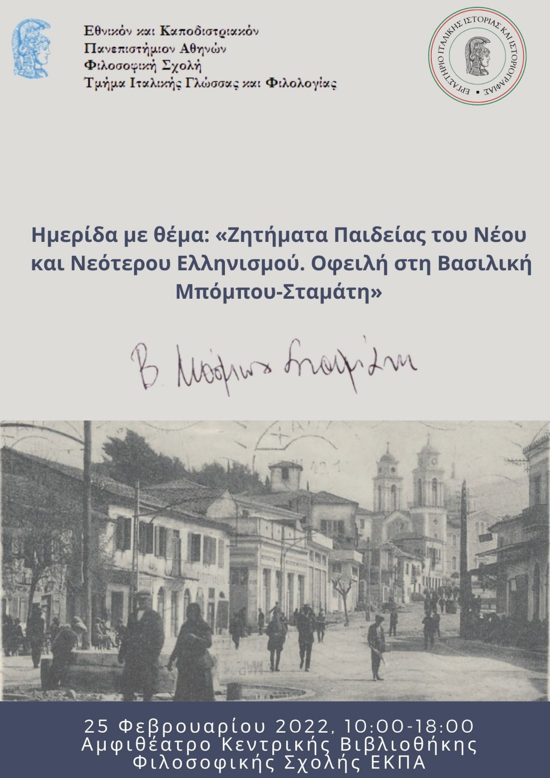 Ημερίδα με θέμα: «Ζητήματα Παιδείας του Νέου και Νεότερου Ελληνισμού. Οφειλή στη Βασιλική Μπόμπου-Σταμάτη (1932-2020)»