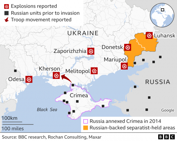 Η εισβολή που άρχισε στις 5 το ξημέρωμα και αιφνιδίασε τους πάντες αν και την περίμεναν έχει σαν στόχο πόλεις και περιοχές της Ουκρανίας τις οποίες οι Ρώσοιο θεωρούν κομβικές.