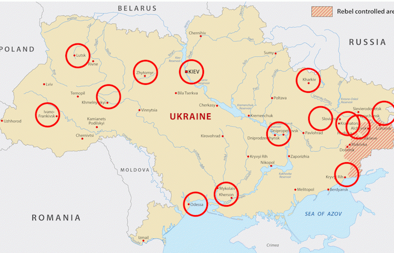 Όπως αναφέρει το Anadolou, το Κίεβο, το Κραματόρσκ, η Μαριούπολη, το Μικολαΐβ, η Οδησσός έχουν δεχθεί επίθεση.