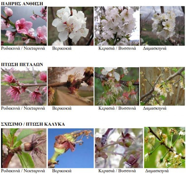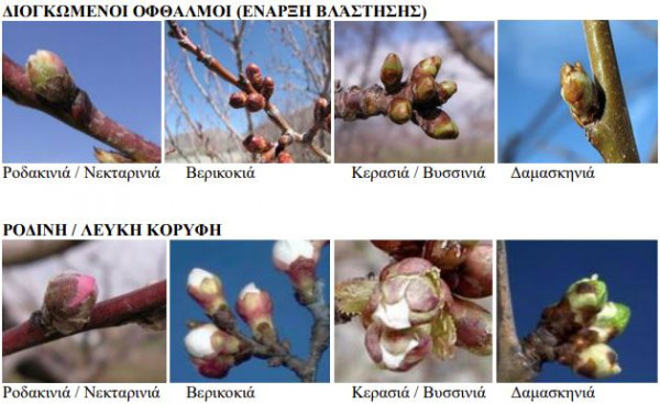Οι παρακάτω φωτογραφίες, που περιέχονται στο ενημερωτικό δελτίο του Περιφερειακού Κέντρου Προστασίας Φυτών, Ποιοτικού και Φυτοϋγειονομικού Ελέγχου Βόλου, δείχνουν τα βλαστικά στάδια της ροδακινιάς, νεκταρινιάς, βερικοκιάς, κερασιάς και δαμασκηνιάς.