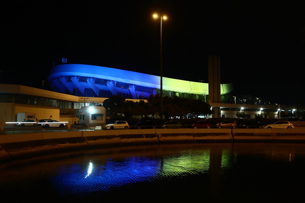 Η διοίκηση του Σταδίοτ φώτισε με μπλε και κίτρινο, με τα χρώματα της Ουκρανίας δηλαδή, το εξωτερικό του ΣΕΦ δείχνοντας με αυτόν τον τρόπο τη συμπαράστασή της προς της χώρα.