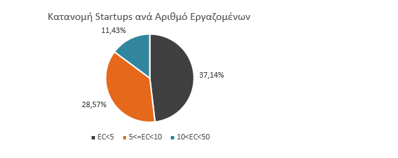 Παρατηρούμε ότι το 1/3 των νεοφυών επιχειρήσεων έχει ως 5 άτομα προσωπικό, ενώ η διάμεσος είναι 4 άτομα. Ωστόσο, συγκρίνοντας τα δεδομένα μεταξύ των δύο κατηγοριών agro-startups, παρατηρούμε ότι η μεγάλη πλειοψηφία των foodtech είναι πολύ μικρές εταιρείες, σε αντίθεση με τις agritech που παρουσιάζουν λίγο μεγαλύτερο μέγεθος. Η ύπαρξη λίγων ατόμων καταδεικνύει ότι στο startup οικοσύστημα του αγροτικού τομέα απουσιάζει η χρηματοδότηση που θα επέτρεπε την ανάπτυξή τους.