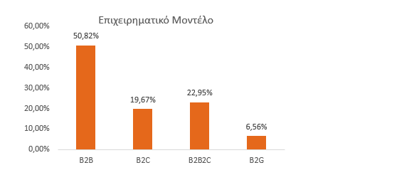 Οι μισές αγροτικές startups έχουν επιχειρηματικό μοντέλο Β2Β. Δεύτερη σε σπουδαιότητα έρχεται η κατηγορία B2B2C και μάλιστα σε αυτή την δεύτερη κατηγορία είναι μεγαλύτερη η αριθμητική συμμετοχή agritech εταιρειών σε σχέση με τις foodtech εταιρείες.