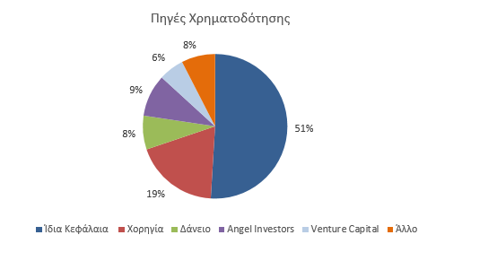 Περίπου τα δύο τρίτα των αγροτικών startups δεν έχουν λάβει επίσημη χρηματοδότηση (51% ίδια κεφάλαια, 8% άλλο, συνήθως οικογένεια και φίλοι). Έχει ενδιαφέρον ότι για τις agritech το ποσοστό των εταιρειών που έχει λάβει χρηματοδότηση, σε σχέση με εκείνες που δεν έχουν λάβει, είναι υψηλότερο από ότι συμβαίνει στις foodtech.