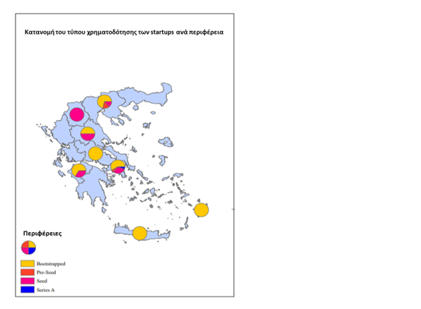 Στον πιο κάτω πίνακα μπορούμε να δούμε πώς κατανέμεται η χρηματοδότηση ανά περιφέρεια. Η Κρήτη, η Κεντρική Ελλάδα και το Βόρειο Αιγαίο φαίνεται να στηρίζονται εξ ολοκλήρου σε ίδια κεφάλαια, ενώ η Δυτική Μακεδονία σε κεφάλαιο σποράς. Στις υπόλοιπες περιφέρειες παρουσιάζεται μια μικτή εικόνα.