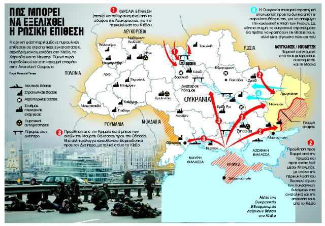 Ο ρωσικός στρατός υπερτερεί συντριπτικά του ουκρανικού, με αποτέλεσμα να προελαύνει τις δύο πρώτες ημέρες του πολέμου. Οι περισσότεροι αναλυτές συμφωνούν ότι στόχος είναι να περικυκλωθεί το Κίεβο και να παραλύσει η πολιτική και στρατιωτική δομή της Ουκρανίας, τη στιγμή που ο κύριος όγκος του στρατού της θα έχει αποκοπεί στο ανατολικό τμήμα της χώρας. Ο Πούτιν ζήτησε προχθές την παράδοση της χώρας, προκειμένου να εγκαταστήσει φιλορωσική κυβέρνηση στο Κίεβο, να αποκτήσει τον έλεγχο του μεγαλύτερου μέρους των ακτών, αν όχι όλης της χώρας, και να συνδέσει την Κριμαία με τη ρωσική ηπειρωτική χώρα.