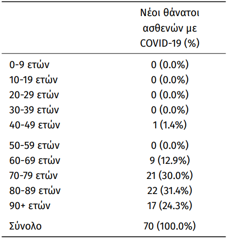 Οι νέοι θάνατοι ασθενών με COVID-19 είναι 70, ενώ από την έναρξη της επιδημίας έχουν καταγραφεί συνολικά 25.860 θάνατοι. Το 95.1% είχε υποκείμενο νόσημα ή/και ηλικία 70 ετών και άνω.