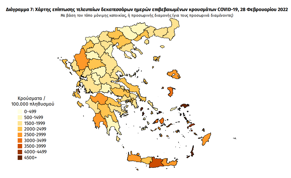 Ο χάρτης αποτυπώνει τη γεωγραφική κατανομή των συνολικών κρουσμάτων COVID-19 (από την αρχή της επιδημίας) ανά Περιφερειακή Ενότητα της χώρας, με βάση την δηλωθείσα διεύθυνση μόνιμης κατοικίας του ασθενούς, ή τη διεύθυνση προσωρινής διαμονής για τους τουρίστες και άλλους προσωρινά διαμένοντες στην Ελλάδα. Συμπεριλαμβάνονται τόσο κρούσματα με ιστορικό ταξιδίου (“εισαγόμενα”) όσο και κρούσματα με πιθανή εγχώρια μετάδοση.