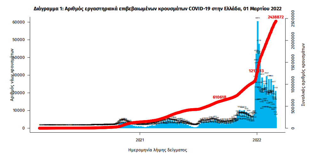 Τα νέα εργαστηριακά επιβεβαιωμένα κρούσματα της νόσου που καταγράφηκαν τις τελευταίες 24 ώρες είναι 17.176, εκ των οποίων 45 εντοπίστηκαν κατόπιν ελέγχων στις πύλες εισόδου της χώρας. Ο συνολικός αριθμός των κρουσμάτων ανέρχεται σε 2.438.872 (ημερήσια μεταβολή +0.7%), εκ των οποίων 49.5% άνδρες.