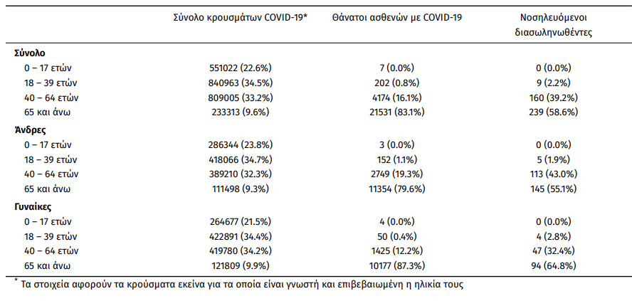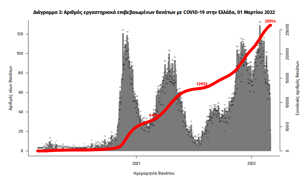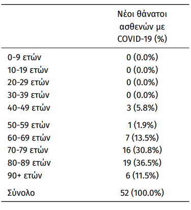 Οι νέοι θάνατοι ασθενών με COVID-19 είναι 52, ενώ από την έναρξη της επιδημίας έχουν καταγραφεί συνολικά 25.914 θάνατοι. Το 95.1% είχε υποκείμενο νόσημα ή/και ηλικία 70 ετών και άνω.