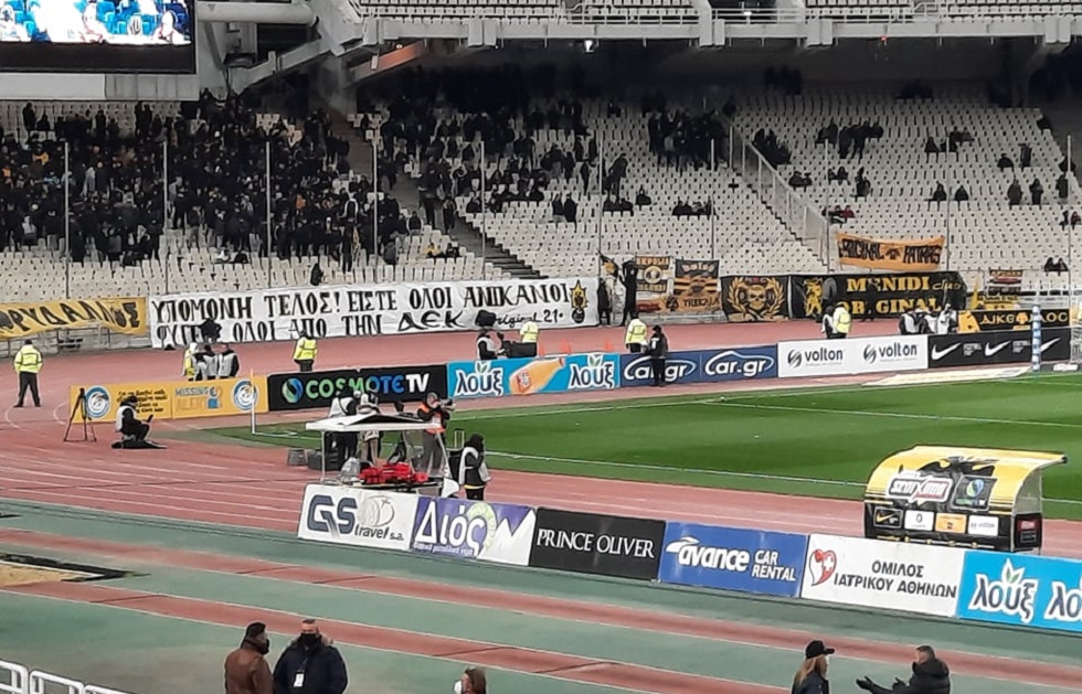 Η οργή πλέον ξεχειλίζει, με τον κόσμο της ΑΕΚ να βάλλει κατά πάντων. Χαρακτηριστικό ήταν το πανό ανάρτησε η Original στο αποψινό παιχνίδι, το οποίο ανέφερε: «Υπομονή τέλος, είστε όλοι ανίκανοι, φύγετε όλοι από την ΑΕΚ!».