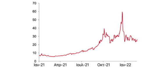 Βέβαια, η άμεση ανταπόκριση των τιμών του φυσικού αερίου στην κλιμάκωση της σύγκρουσης μέχρι τώρα κρίνεται μέτρια, με τις τιμές να αυξάνονται περίπου κατά 10%, το οποίο είναι εντός του εύρους των τιμών που παρατηρήθηκαν μέχρι στιγμής για το 2022 (Διάγραμμα 1). Βεβαίως, η άνοδος δεν είναι ασήμαντη, ειδικά σε σύγκριση με τα χαμηλά επίπεδα τιμών πριν από την εμφάνιση της πανδημίας, επίπεδα στα οποία είχαν βασίσει τα επενδυτικά τους σχέδια πολλοί βιομηχανικοί κλάδοι.