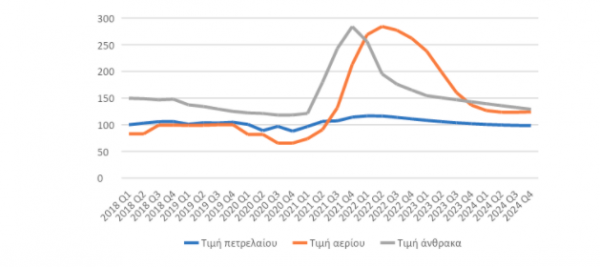 Διάγραμμα 4. Δείκτες εγχώριας τιμής αερίου, πετρελαίου και άνθρακα στην Ελλάδα (2010=100)
