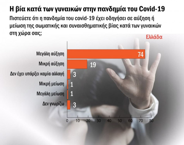 Μάλιστα, σύμφωνα με την έρευνα, το 93% των γυναικών στην Ελλάδα εκτιμά πως η πανδημία του κοροναϊού οδήγησε στην αύξηση της σωματικής βίας κατά των γυναικών στη χώρα ενώ τα 60% εντοπίζει αρνητικό αντίκτυπο στο εισόδημά τους, ποσοστό αρκετά μεγαλύτερο από τον ευρωπαϊκό μέσο όρο.