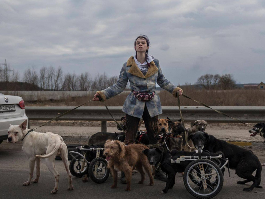 Η συγκεκριμένη γυναίκα βρίσκεται στην περιοχή του Ιρπίν που έχει δεχθεί απανωτούς βομβαρδισμούς, καθώς είναι πολύ κοντά στην ουκρανική πρωτεύουσα, Κίεβο. Η γυναίκα επιχειρεί να μεταφέρει τα ανάπηρα ζώα από το καταφύγιο που βρίσκονταν σε ασφαλές μέρος.