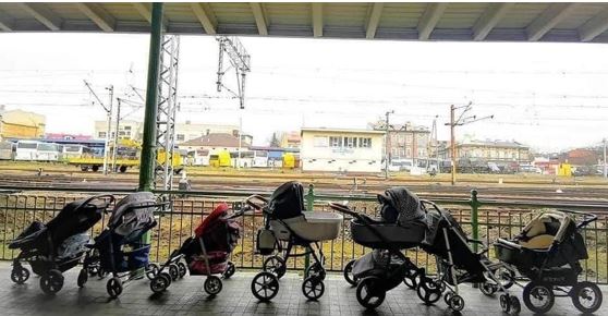 Παιδικά καρότσια εγκαταλελειμμένα σε σταθμό τρένου από πρόσφυγες που εγκατέλειψαν την Ουκρανία για γειτονικές χώρες