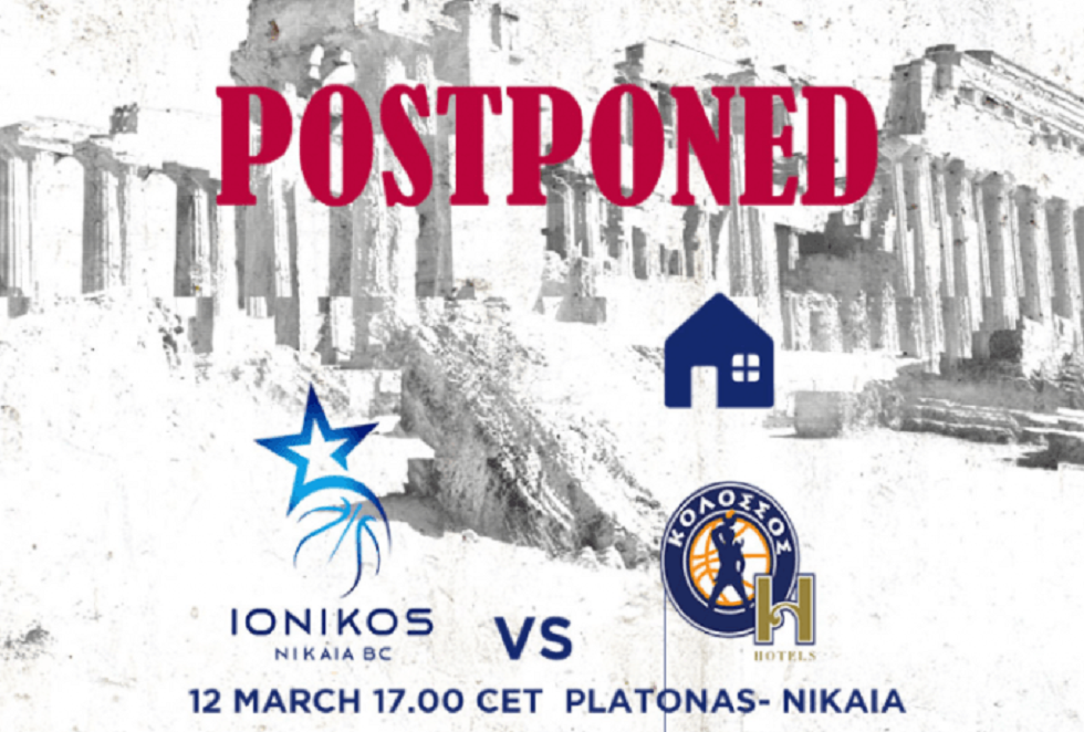 «Η προγραμματισμένη για το Σάββατο 12 Μαρτίου 2022 συνάντηση μεταξύ των ομάδων Ιωνικός – Κολοσσός H Hotels στο πλαίσιο της 17ης αγωνιστικής Stoiximan Basket League, αναβάλλεται, σύμφωνα με το Υγειονομικό Πρωτόκολλο της Stoiximan Basket League για λόγους ανωτέρας βίας, μετά τα κρούσματα κορωνοϊού που διαγνώσθηκαν σε αθλητές της ομάδας τoυ Κολοσσού H Hotels.