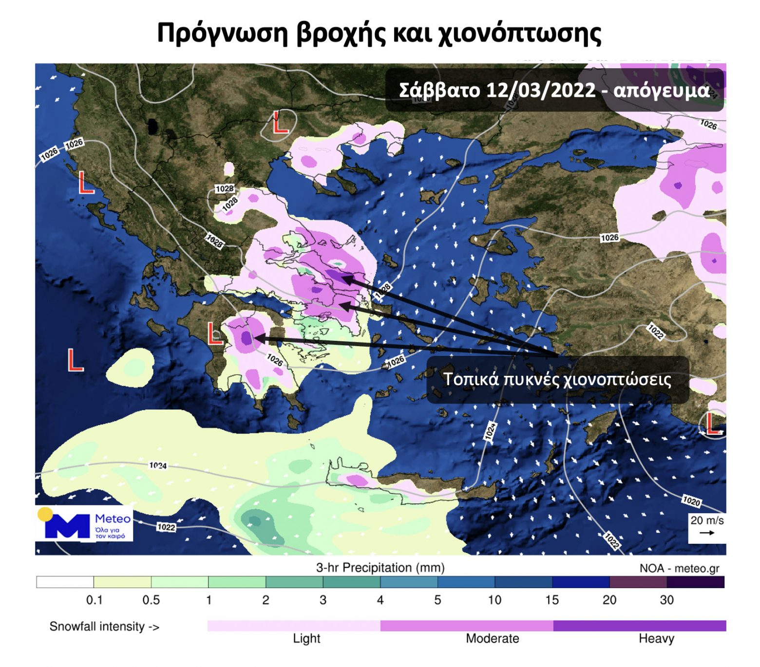 Ήδη από το πρωί του Σαββάτου πυκνές χιονοπτώσεις καταγράφονται στις Β. Σποράδες και την Εύβοια, οι οποίες θα επεκταθούν νοτιότερα και πιο δυτικά κατά τη διάρκεια της ημέρας, επηρεάζοντας την υπόλοιπη Μαγνησία, τη Φθιώτιδα, τη Βοιωτία, την Αττική και το μεγαλύτερο μέρος της Πελοποννήσου (Χάρτης). Χιονόνερο και χιονοπτώσεις θα σημειωθούν στις Δυτικές Κυκλάδες και στην Κρήτη (κυρίως στα δυτικά τμήματα του νησιού) όπου στα ορεινά της Δυτικής Κρήτης τα φαινόμενα θα είναι έντονα, με σταδιακή εξασθένηση το βράδυ.