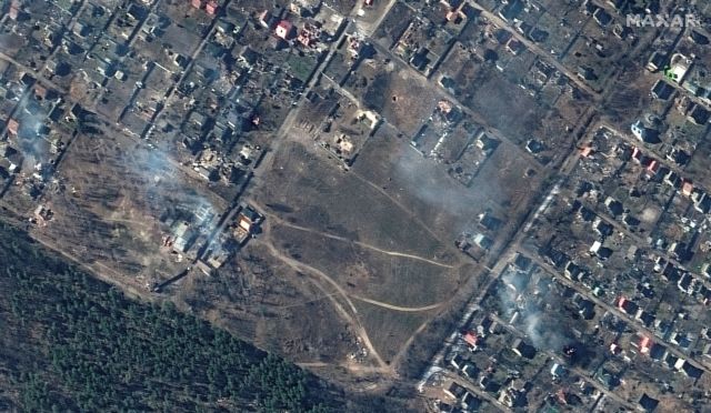 Οι εικόνες από δορυφόρο αποτυπώνουν την κατάσταση που επικρατεί στο Κίεβο, με τις ρωσικές δυνάμεις που αναπτύσσονται πιο κοντά στην πόλη να βάλλουν με το πυροβολικό, κτίρια και σπίτια να τυλίγονται στις φλόγες και να προκαλούνται εκτεταμένες ζημιές και κρατήρες.