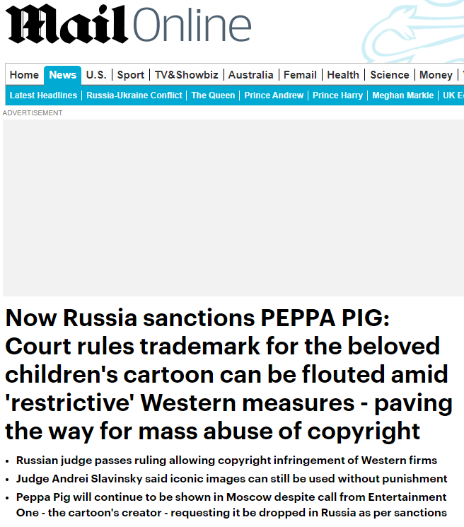 Η δικαστική απόφαση συνδέει την αξίωση για παραβίαση των «Peppa Pig» και «Daddy Pig» με «μη φιλικές ενέργειες των Ηνωμένων Πολιτειών της Αμερικής και των συνδεδεμένων ξένων χωρών» σύμφωνα με νομικά έγγραφα από την υπόθεση.