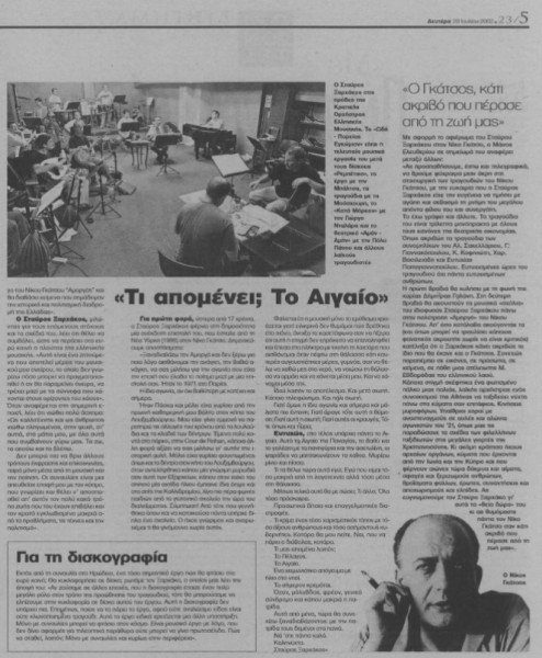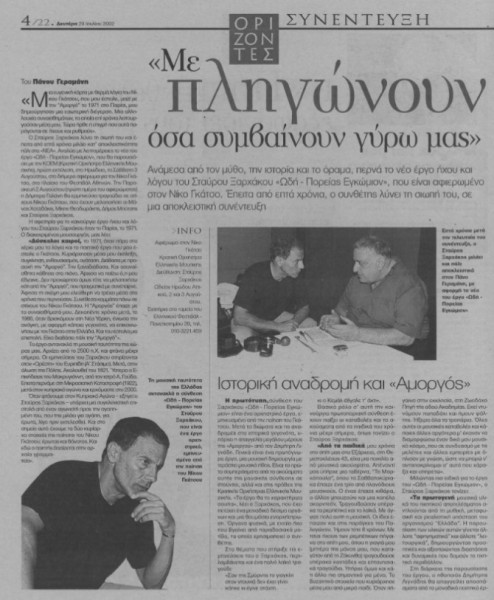 «Μια ευγενική κάρτα με θερμά λόγια του Νίκου Γκάτσου, που μου έστειλε μαζί με την Αμοργό το 1971 στο Παρίσι, μου δημιούργησαν μια εσωτερική διέγερση. Μια αλληλουχία συναισθημάτων, τα οποία επί χρόνια λειτουργούσαν μέσα μου. Τώρα ήρθε η στιγμή που αυτά παράγονται σε ήχους και ρυθμούς» διαβάζουμε στο φύλλο των «Νέων» που είχε κυκλοφορήσει τη Δευτέρα 29 Ιουλίου 2002, με τη συνέντευξη του Ξαρχάκου στον Γεραμάνη να τιτλοφορείται «Με πληγώνουν όσα συμβαίνουν γύρω μας».