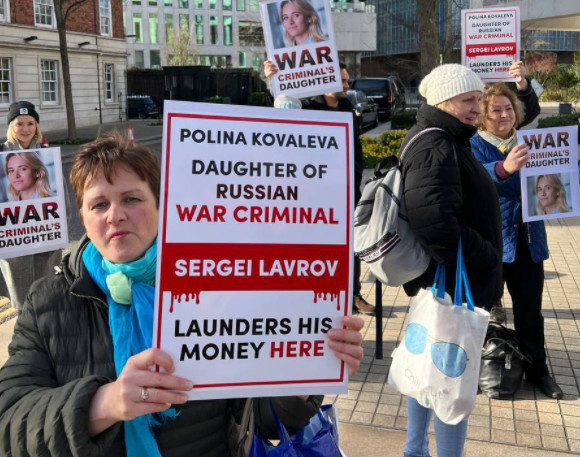 Διαμαρτυρία έξω από το σπίτι της 26χρονης Πολίνα Κοβάλεβα, θετής κόρης του ρώσου υπουργού Εξωτερικών, Σεργκέι Λαβρόφ, πραγματοποίησαν διαδηλωτές στο Λονδίνο.