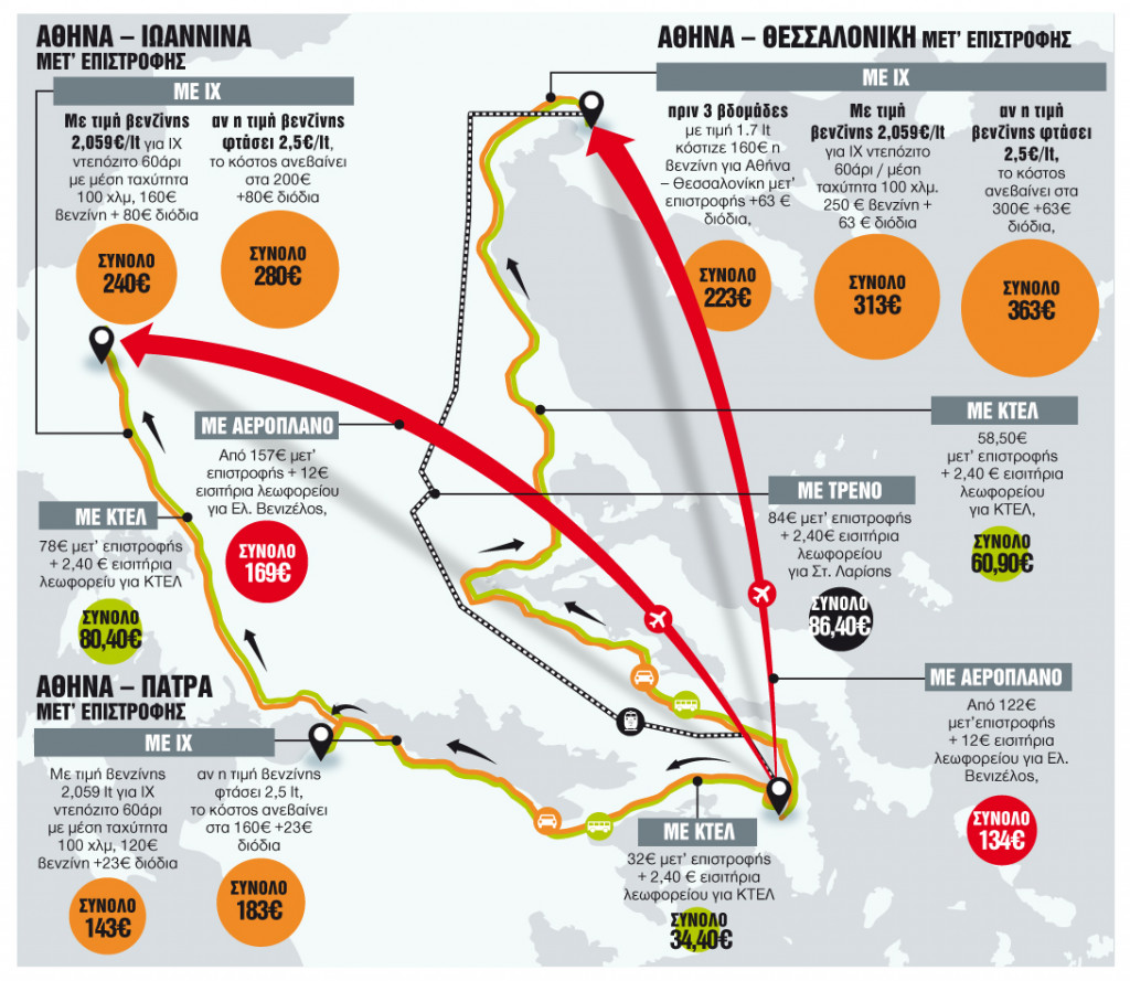 Χαρακτηριστικό της πρωτόγνωρης συγκυρίας είναι ότι ενώ το κόστος σήμερα οδικώς είναι 313 ευρώ, αεροπορικώς είναι περίπου το μισό, αφού τα εισιτήρια για Αθήνα – Θεσσαλονίκη μετ’ επιστροφής ξεκινούν από 122 ευρώ. Ακόμα και αν προσθέσει κανείς τα έξοδα για την άφιξη και την επιστροφή από το αεροδρόμιο (12 ευρώ τα εισιτήρια λεωφορείου), το κόστος για Αθήνα – Θεσσαλονίκη δεν ξεπερνά τα 134 ευρώ, δηλαδή λιγότερο και από το μισό του κόστους με ΙΧ.