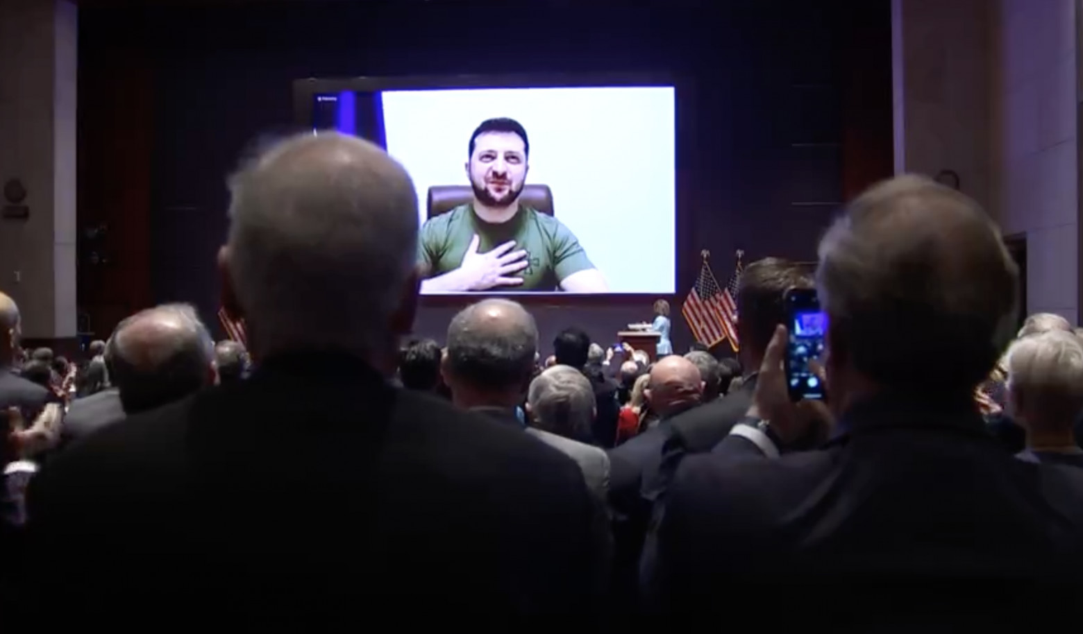 «Έριξαν τανκς και αεροπλάνα εναντίον της ελευθερίας μας, εναντίον του δικαιώματός μας να ζούμε ελεύθερα στη χώρα μας, επιλέγοντας αυτοί το μέλλον μας. Ενάντια στην επιθυμία μας για ευτυχία, ενάντια στο εθνικό μας όνειρο, όπως ακριβώς τα ίδια όνειρα που έχετε κι εσείς, εσείς οι Αμερικανοί. Ακριβώς όπως όλοι οι άλλοι στις Ηνωμένες Πολιτείες», ανέφερε ο Ζελένσκι.