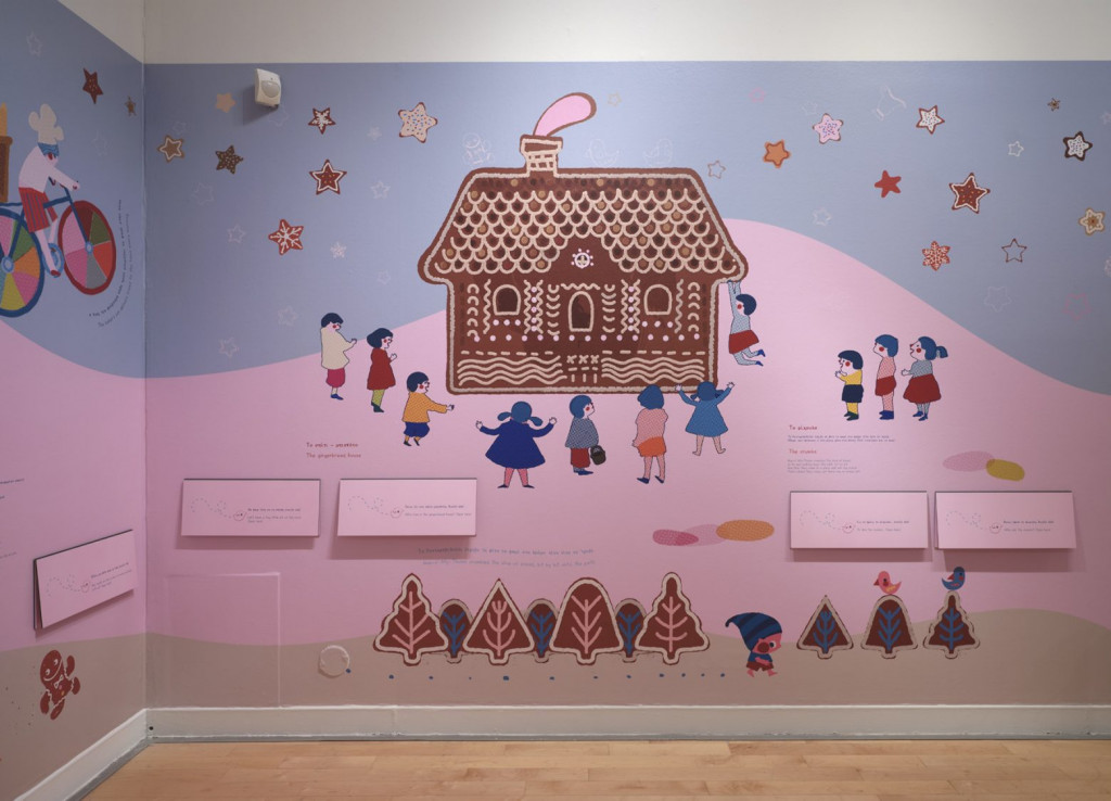 Ο επόμενος χώρος ήταν αφιερωμένος στα παιδιά – τους μεγαλύτερους λάτρεις των πεντανόστιμων γλυκισμάτων – και στα παραμύθια που έχουν εστιάσει σε αυτή την αγάπη. Ο Κοντορεβυθούλης, ο Χάνσελ και η Γκρέτελ, ο Σιμιγδαλένιος και άλλες αγαπημένες ιστορίες με θέμα τις ζύμες, τα μπισκότα και τα ψωμιά ζωντάνεψαν στην τρυφερή εικονογράφηση της Μυρτούς Δεληβοριά και τα κείμενα της Ειρήνης Βοκοτοπούλου, ενώ οι μικροί θεατές είχαν την ευκαιρία να συμμετέχουν και εκπαιδευτικά προγράμματα που δημιούργησε το μουσείο στο πλαίσιο της έκθεσης.