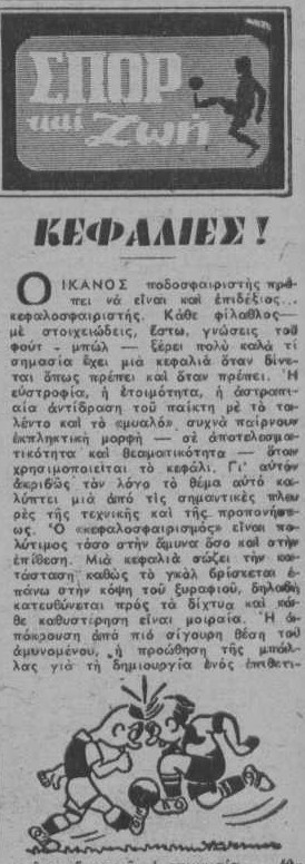 « Η απόκρουση (…), η προώθηση της μπάλλας για τη δημιουργία ενός επιθετικού συνδυασμού, η στιγμιαία – αλλά και με απρόβλεπτες εξελίξεις – νίκη στην εναέρια αναμέτρηση δύο αντιπάλων, το πασσάρισμα και τέλος η κεφαλιά που ρίχνει τη μπάλλα στα δίχτυα είναι οι πιο τυπικές εκδηλώσεις του κεφαλοσφαιρισμού».