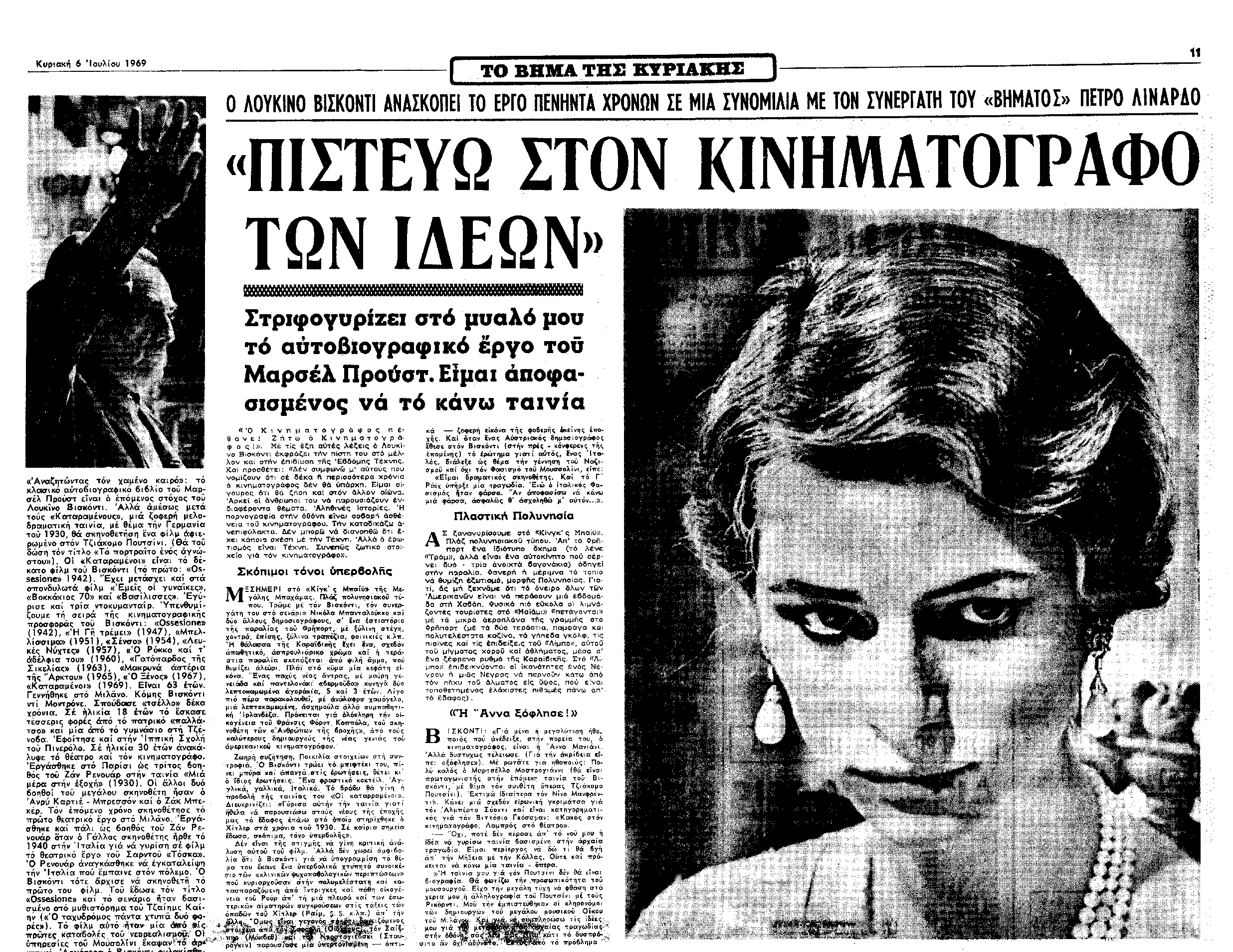 »Το βράδυ θα γίνη η προβολή της ταινίας του “Οι καταρραμένοι”. Διευκρινίζει: “Γυρίσα αυτήν την ταινία γιατί ήθελα να παρουσιάσω στους νέους της εποχής μας το έδαφος επάνω στο οποίο στηρίχθηκε ο Χίτλερ στα χρόνια του 1930. Σε καίρια σημεία έδωσα, σκόπιμα, τόνο υπερβολής”