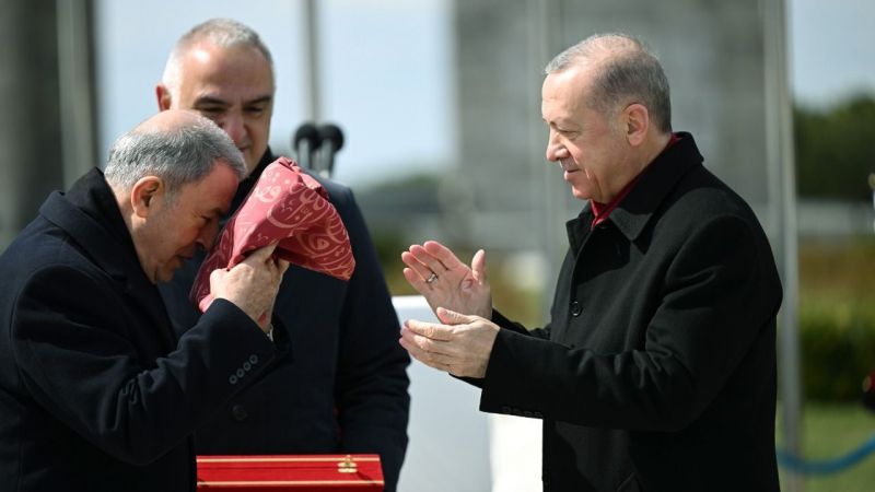 Κατόπιν την παρέδωσε στον υπουργό Αμυνας Χουλουσί Ακάρ. Τη φίλησε και αυτός τρεις φορές πριν την ακουμπήσει στο μέτωπό του.