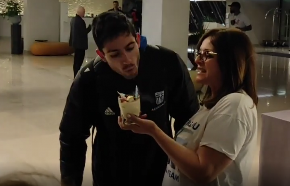 Φυσικά, στο ξενοδοχείο τον περίμενε θερμή υποδοχή από την οικογένειά του και τα μέλη της ελληνικής αποστολής που του τραγούδησαν για τα γενέθλια του και γιόρτασαν ξανά μαζί του την κατάκτηση του μεταλλίου.
