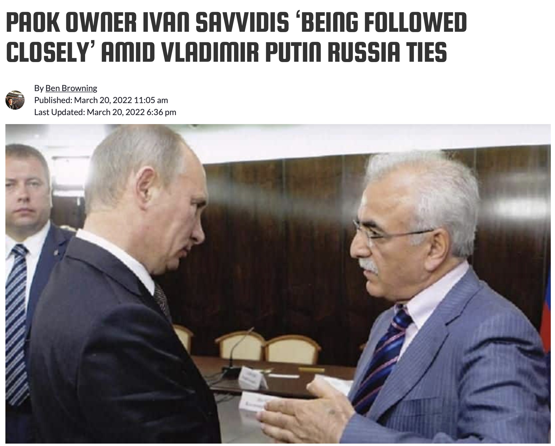 Ο ελληνορωσικής καταγωγής επιχειρηματίας Ιβάν Σαββίδης, διατηρεί στενούς δεσμούς με τον Ρώσο πρόεδρο Βλαντιμίρ Πούτιν, αναφέρει η ιστοσελίδα 101greatgoals.com σε σημερινό της δημοσίευμα με τίτλο: Ο ιδιοκτήτης του ΠΑΟΚ Ιβάν Σαββίδης «παρακολουθείται στενά» για τους δεσμούς του με τον Βλαντιμίρ Πούτιν.