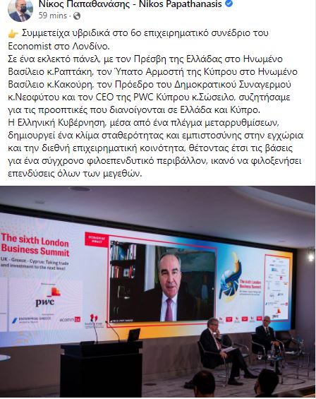 «Συμμετείχα υβριδικά στο 6ο επιχειρηματικό συνέδριο του Economist στο Λονδίνο. Σε ένα εκλεκτό πάνελ, με τον Πρέσβη της Ελλάδας στο Ηνωμένο Βασίλειο κ. Ραπτάκη, τον Ύπατο Αρμοστή της Κύπρου στο Ηνωμένο Βασίλειο κ. Κακούρη, τον Πρόεδρο του Δημοκρατικού Συναγερμού κ. Νεοφύτου και τον CEO της PWC Κύπρου κ. Σώσειλο, συζητήσαμε για τις προοπτικές που διανοίγονται σε Ελλάδα και Κύπρο. Η Ελληνική Κυβέρνηση, μέσα από ένα πλέγμα μεταρρυθμίσεων, δημιουργεί ένα κλίμα σταθερότητας και εμπιστοσύνης στην εγχώρια και την διεθνή επιχειρηματική κοινότητα, θέτοντας έτσι τις βάσεις για ένα σύγχρονο φιλοεπενδυτικό περιβάλλον, ικανό να φιλοξενήσει επενδύσεις όλων των μεγεθών».