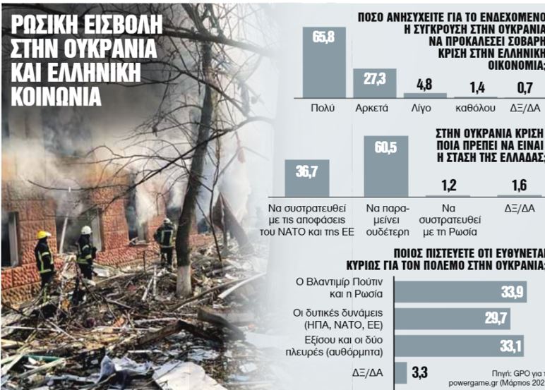 Τα στοιχεία από την τελευταία μέτρηση της GPO είναι αποκαλυπτικά: το 97,1% του πληθυσμού ανησυχεί για το ενδεχόμενο η ουκρανική κρίση να οδηγήσει σε περαιτέρω αυξήσεις τιμών στα βασικά αγαθά και στα τιμολόγια ενέργειας, ενώ το 93% αναμένει πολύ σοβαρή επιδείνωση της ελληνικής οικονομίας.