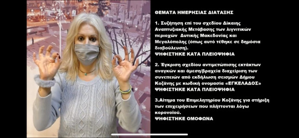 Σε αυτή την κατεύθυνση το Δημοτικό Συμβούλιο Κοζάνης, υλοποιεί μια καινοτόμα δράση για τα δεδομένα της χώρας, αποδίδοντας στην Ελληνική Νοηματική Γλώσσα τις αποφάσεις που λαμβάνει.