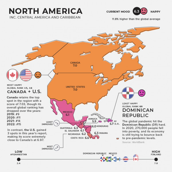 Η Βόρεια Αμερική έχει μέσο όρο το 6,3. Ο Κάναδάς είναι η πιο ευτυχισμένη χώρα με 7,0 αλλά και οι ΗΠΑ έχουν ανέβει τρεις θέσεις και έπιασαν και αυτές το 7,0. Το Μεξικό είναι στο 6,1