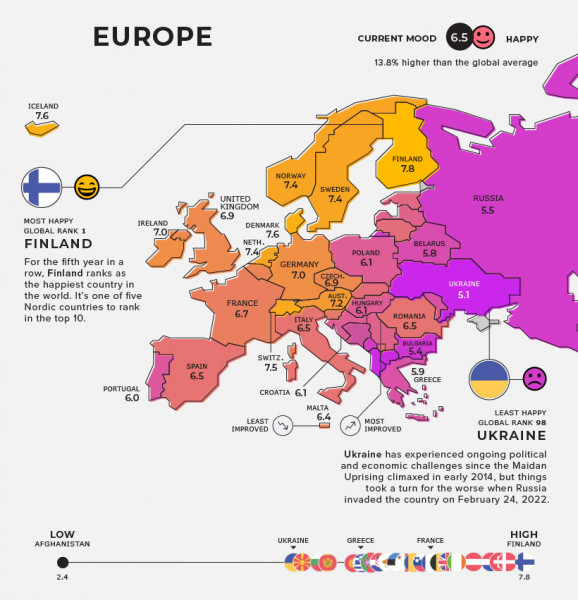 Η Ευρώπη είναι από τις πιο ευτυχισμένες ηπείρους να ζει κάποιος. Έχει μέσο όρο το 6,5 ενώ η Φιλανδία με 7,8 είναι όχι μόνο η πιο ευτυχισμένη χώρα της Ευρώπης αλλά και του κόσμου. (Στην Ουκρανία δεν έχει προσμετρηθεί ο πόλεμος αφού η έρευνα έγινε πριν τις 24/2)