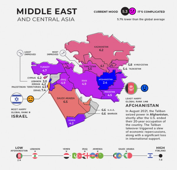 Ο μέσος όρος σε αυτές τις χώρες είναι το 5,2. Βέβαια υπάρχουν χώρες όπως η Σαουδική Αραβία με 6,5 το Ισραήλ και η Κύπρος με 6,2 που είναι ευτυχισμένες και χώρες όπως το Αφγανιστάν με 2,4 που αγγίζουν τα όρια της κατάθλιψης.