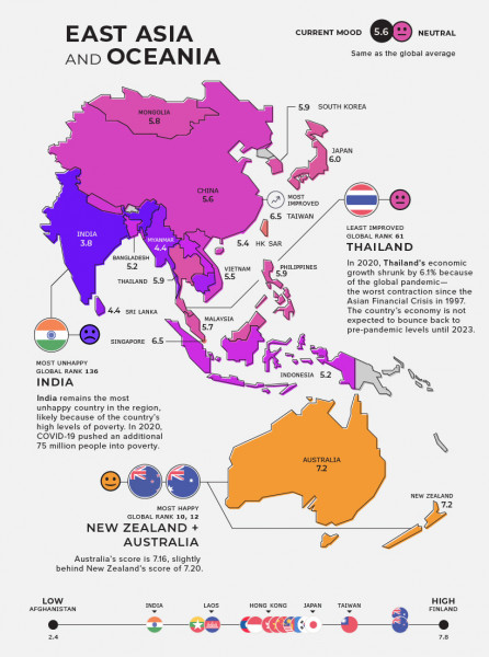 Οι χώρες αυτές βρίσκονται στο όριο της ευτυχίας με 5,6. Αυστραλία και Νέα Ζηλανδία έχουν μέσο όρο το 7,2 και στον αντίποδα η Ινδία έχει μέσο όρο το 3,8