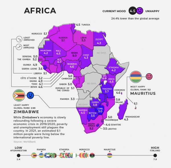 Στην Αφρική τα πράγματα δεν είναι καλά Έχει μέσο όρο το 4,5 και οι άνθρωποι δεν είναι ευτυχισμένοι. Ο Μαυρίκιος είναι η πιο ευτυχισμένη χώρα της με 6,1 και η Ζιμπάμπουε η πιο δυστυχισμένη με 3,0.