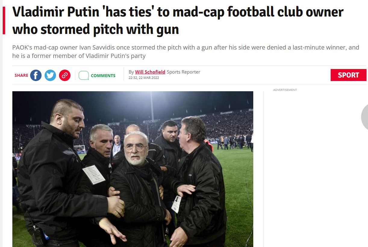 «Ο Βλαντιμίρ Πούτιν “έχει δεσμούς” με έναν τρελάρα ιδιοκτήτη ποδοσφαιρικής ομάδας, ο οποίος εισέβαλε στο γήπεδο με όπλο» είναι ο τίτλος δημοσιεύματος στην ηλεκτρονική έκδοση της Daily Star σχετικά με τις σχέσεις του Ρώσου Προέδρου με τον Ελληνορώσο παράγοντα.