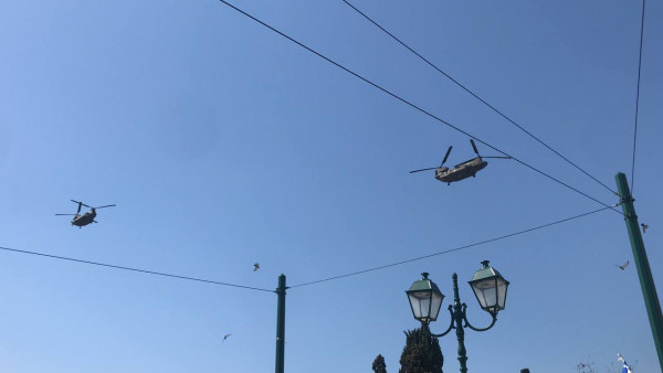 Εντυπωσιακοί είναι οι σχηματισμοί των επιθετικών ελικοπτέρων Απάτσι της Αεροπορίας Στρατού στην παρέλαση, στο πλαίσιο των εορτασμών της επετείου της 25ης Μαρτίου.