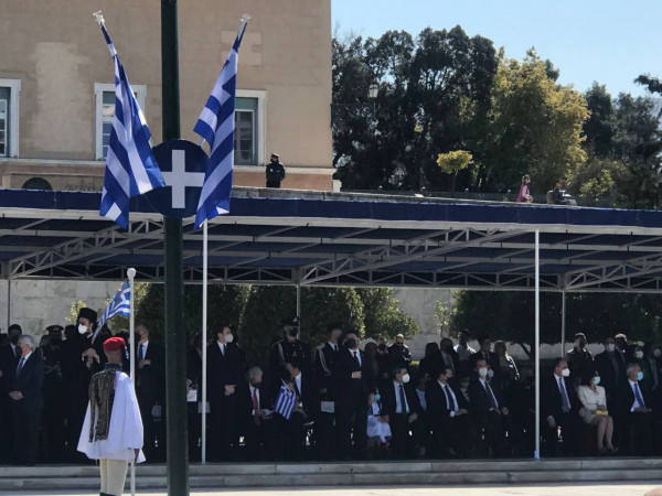Παρόντες στο Σύνταγμα, o υπουργός Εθνικής Άμυνας, Νίκος Παναγιωτόπουλος, η πρόεδρος της Δημοκρατίας, Κατερίνα Σακελλαροπούλου και η υπουργός Άμυνας της Γαλλίας, Φλοράνς Παρλί.