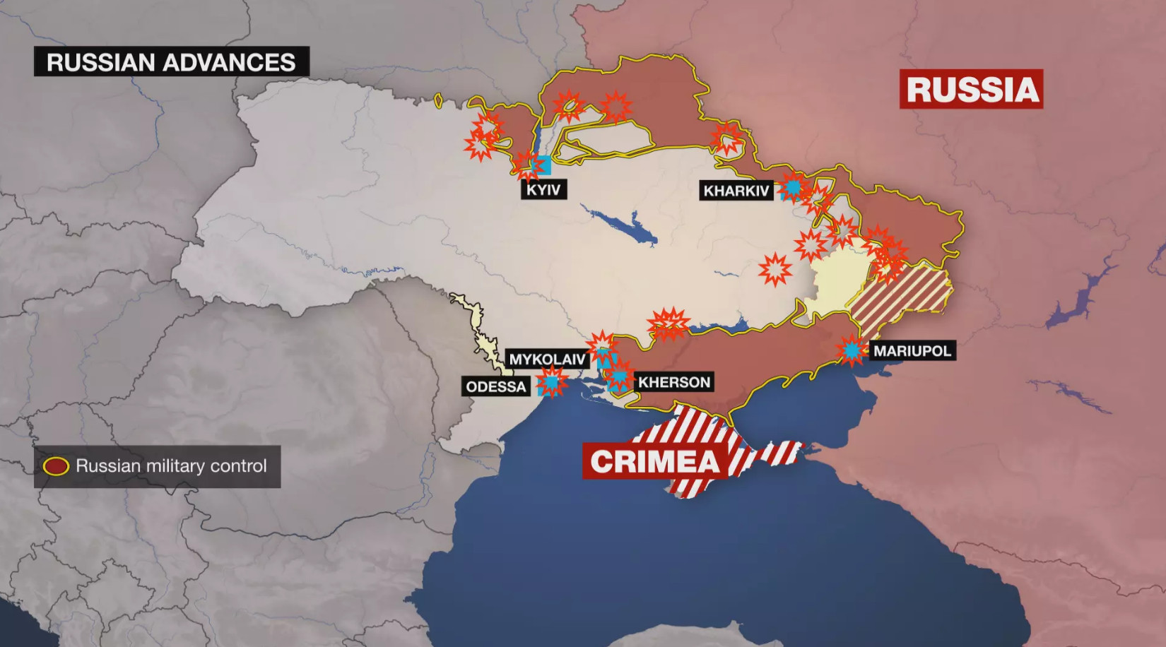 «Ακόμα και το Χάρκοβο, το οποίο βρίσκεται στα σύνορα με τη Ρωσία, δεν είναι ακόμη εντελώς στα χέρια των Ρώσων. Η μόνη πόλη (σ.σ. υπό ρωσικό έλεγχο) είναι η Χερσώνα. Το Κίεβο δεν έχει πέσει. Υπάρχουν αδιάκοπες μάχες και βομβαρδισμοί στη Μαριούπολη, αλλά ένα μεγάλο μέρος της πόλης είναι ακόμη στα χέρια των Ουκρανών», επισήμανε ο Τουρλέ.