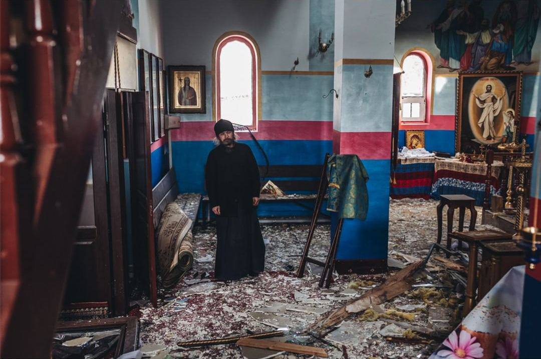 Μεγάλες είναι οι ζημιές στην εκκλησία που βρίσκεται στη Γιασνογκορόντκα, με τον ιερωμένο να στέκεται στη μέση του ναού ανήμπορος να αντιδράσει.