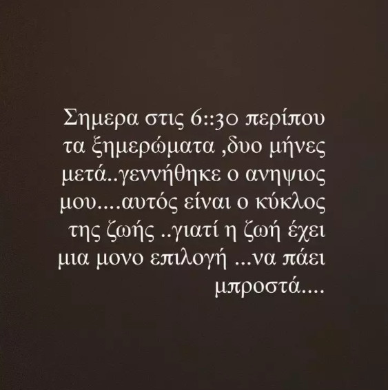 «Σήμερα στις 6:30 περίπου τα ξημερώματα, δυο μήνες μετά… γεννήθηκε ο ανιψιός μου… αυτός είναι ο κύκλος της ζωής… γιατί η ζωή έχει μια μόνο επιλογή… να πάει μπροστά…» έγραψε η Διονυσία Γεωργιάδου.
