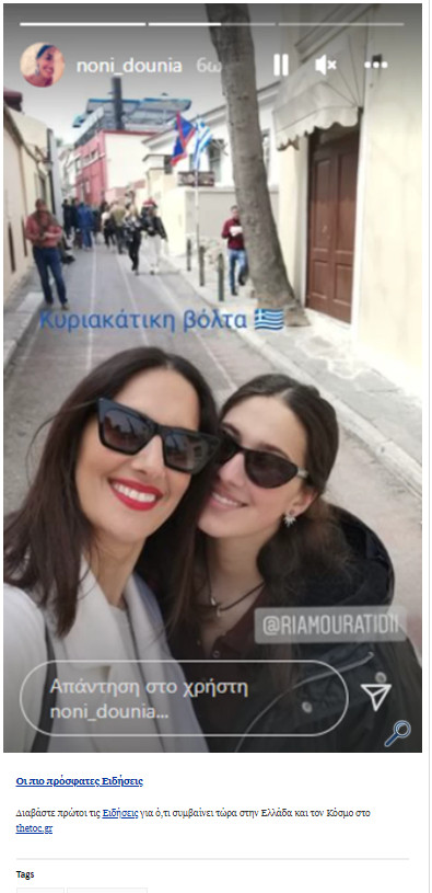 Η Νόνη Δούνια ανήρτησε στα stories του λογαριασμού της στο instagram μία φωτογραφία από τη βόλτα τους, γράφοντας χαρακτηριστικά στην ανάρτησή της «Κυριακάτικη βόλτα».